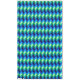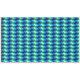 A 60” x 104” tablecloth featuring a colourful, ombre pattern design of chevrons in lime green, royal turquoise, ocean blue and sky blue.