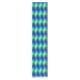 A 14” x 72” table runner featuring a colourful, ombre pattern design of chevrons in lime green, royal turquoise, ocean blue and sky blue.