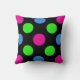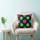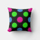 Festive and fun is the best way to describe this polka dot circles pillow. This square polyester pillow is a great size for sofas or beds and will brighten up any room with its hot pink, lime green, and baby blue dots scattered on a black background.