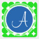 Green dots in close quarters create a secondary pattern of white stars. A large blue circle is surrounded by white lines, while a single white initial graces the centre.
