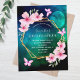 A tropical floral Quinceañera, 15th (or any age) birthday party invitation with pink hibiscus flowers, greenery, butterflies and a faux gold geometric frame. A dark blue and green northern light night sky with a full moon as background. Templates for a name written with a modern handlettered style script, templates for your party information. White text.