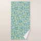 This towel set has a light blue washcloth, a light green hand towel, and a bath towel with a Boho design of overlapping spirals in blue and green on a field of white.