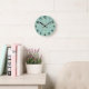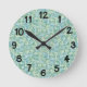 This wall clock has a Boho design of overlapping spirals in blue and green on a field of white.