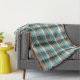 This cosy throw blanket features a traditional turquoise, tan, and white tartan plaid image.