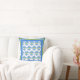 A throw pillow or cushion, with an Art Nouveau pattern in bright blue, white and green, from a handpainted design by Judy Adamson.