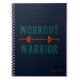 A modern fitness journal to track path to fitness and health. The simple design features a dark blue cover with a burnt orange barbell design and Workout Warrior in a green grunge typography. Personalise with the year and your monogram