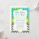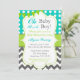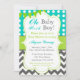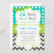 Invite your guests to your baby shower in a fun way with this grey, blue and green chevron and polka dots personalised invitation.
