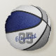 This basketball team colours pillow for a girl or boy features the realistic image of a basketball that has alternating blue, white and grey recolored panels - personalise with player name in an "autograph" style font overlying the athlete's jersey number - by katz_d_zynes