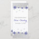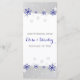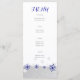 Blue and white snowflakes and silver grey stars modern and contemporary wedding menu card highlighting blue and white snowflakes and stars on grey or grey background. A pperfect choice of a menu card for a December Christmas winter wedding.
