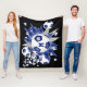 This sporty soccer themed fleece blanket for boys or girls features an "explosion" of blue and white soccer balls in varying sizes and blue and grey comic style star shapes on a customisable black background - personalise with monogram or varsity letter and jersey number - katz_d_zynes