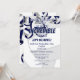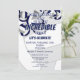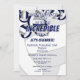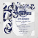 This volleyball themed party invitation for a team celebration features navy blue and grey team colours volleyballs accenting the top edge on the front and covering the back of the invitation - an abstractly oversized volleyball that has light grey & white panels provides the background for your party details on the front of the card - by katz_d_zynes