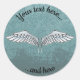 Wide open blue-grey wings illustration. Grunge blue background. Top and bottom custom text.