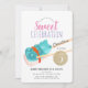 This cute " sweet celebration " girl's candy sushi birthday party invitation features a white background with a blue gummy bear candy sushi and a pair of chopsticks. The reverse side features a watercolored background painted in rainbow colours. Personalise it for your needs. You can find matching products at my store.