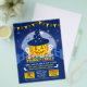 Halloween Trunk or Treat invitation flyer features a kid-friendly cute pumpkin with a blue hat filled with sparkly stars, white ghosts, candies, bats, a colourful banner, a glowing iridescent moon, clouds and sparkly stars with a fence and pathway.