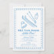 Celebrate your little one on the way with a cosy mountain-inspired "Ski You Soon Little One" baby shower invitation. This winter design features hand-drawn illustrations in soft blue, including skis, poles, a beanie, and a sweet baby bottle—framed by a playful curly doodle border on a crisp white background.