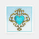 Modern and cute blue heart with a gold crown and ornament over gradient blue background. Optional monogram