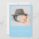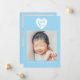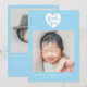 This stylish and elegant 2-sided photo birth announcement template card features 2 photos (front & back) of your newborn baby boy, custom text that can be personalised, and a white heart with a typography text inside that says "thank you" on the top on a blue background. Customise this product by adding your newborn baby's name, pictures, birth stat, and the parents' names.