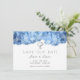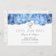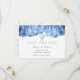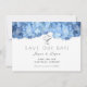 Light blue floral "save our date" wedding announcement with hydrangea flowers along the top. White cards have minimal text with printed and script font styles. Two little hearts decorate the top, and a white floral image decorates the back. This design is also offered on the magnetic cards at BlueHyd.