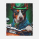 A furry friend behind the handlebars of a shiny green bike, wearing a green Saint Patrick's Day outfit that makes heads turn. The dog is dressed in a festive ensemble, complete with a green bow tie and a matching top hat that sits snugly atop their head. The outfit features intricate designs of shamrocks and leprechauns, making it clear that this dog is ready to celebrate Saint Patrick's Day in style.