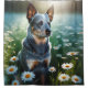 A good looking Blue Heeler dog looking off in the distance in a field of daisies.