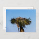 A beautiful blue heron bird sits in its nest on top of a palm tree against a beautiful blue cloudless sky in Florida