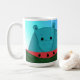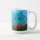 A cute blue hippo ready to eat a juicy slice of watermelon on a soft shaded blue background.