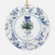 A circle ornament with a blue holly floral pattern on the front and back. There is space for a special photo and one line of text for names, greeting, etc. on the front, and 2 lines of text for names, year, or greeting on the back.