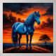 Blue Horse in a Vibrant Sunset Landscape Painting Poster