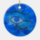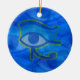 Ceramic ornament with Eye of Horus textured blue with gold outline abstract design. This design features the Horus Eye in blue tones on faded Horus Eyes in the background.
