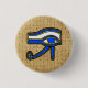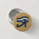 Button with the Ancient Egyptian symbol, the Horus eye on Hieroglyphs. This design features the Horus Eye in blue, yellow and black outlines on top of a Hieroglyphs background.