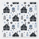Rustic house pattern with dark houses and funny blue flowers on light grey background.