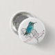 A button pin decorated with a hummingbird perched on a branch drawn with black ink and painted with watercolor in shades of grey and turquoise.