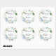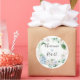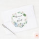 Modern botanical wreath of eucalyptus, hydrangea and roses surrounds the wedding couple names. The names are written in a modern script.