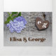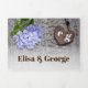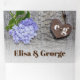 Blue hydrangea and heart on wood rustic tri-fold typography wedding invitation with initials. It showcases a brown rusted metallic heart with initials nailed on weathered grey barn wood board and a blue hydrangea flower. It has plenty of room for your wedding details and it also displays a photo with the initials of the couple on the back outside.