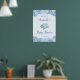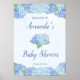 This baby shower poster features blue hydrangea flowers. Personalise it with a name and date. This poster is part of a collection featuring a full range of matching baby shower products.