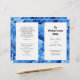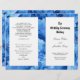 Folded (by customer) wedding program template made for a long, Catholic ceremony lets you add lots of text to all four pages. Bright blue hydrangea flowers make a pretty floral background with white panels to hold the black, template text. Christian scripture or a verse can be added to the back page along with a thank-you message to family, friends and guests.