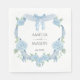 Blue Hydrangea Crest Watercolor Paper Wedding Napkins. Celebrate your special day with these beautiful blue hydrangea wedding napkins. Featuring a delicate watercolor wreath of soft blue hydrangeas and flowing ribbon, this design elegantly frames your names and wedding date. It's perfect for adding a touch of romantic, garden-inspired or French charm to your reception tables, cocktail hour, or any part of your wedding celebration. These napkins are sure to impress your guests and create a memorable experience.