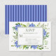 This charming and elegant RSVP card with beautiful, wispy, multi-hued blue hydrangeas and stunning green foliage and coordinating blue striped back is perfect for enclosing with your invitations. Your guests will find it easy to respond to your engagement party. You can easily make it your own by selecting Personalise this template and typing in your response deadline. In seconds you will see your unique and stunning RSVP cards!