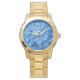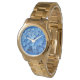 Monogrammed watch for her. Blue hydrangea flowers background with three initials at the top of the face. The letters are white script with a shadow effect to stand out. Shown on a gold watchband with many other options available. Makes a lovely and unique gift for the gardening woman.