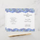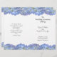 Wedding program template to fold in half, with light blue hydrangea flowers bordering the top and bottom of 8.5 x 11 inch paper to be folded in half after purchase. Customise the front page with title, names of bride and groom, wedding time and location. Inside are templates for the “order of the ceremony” and “the wedding party”. Include a thank you note on the back, or use the space for reception information. The pretty, realistic flowers are from the Blue Moon design line with matching stationery.