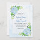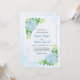 These wedding invitations feature a modern blue hydrangea design with green leaves and foliage on a watercolor canvas background. Personalise them with your own text.
