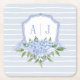 Blue Hydrangea Monogram Crest with Stripes Square Paper Coaster