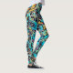 These leggings feature a graphical pattern - urban art style - that's based on a photo of hydrangeas. The pattern has shades of turquoise, black, yellow, pink, as well as other shades. Each leg does not have the exact pattern but has the same hues and similar design elements.