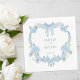 Blue Hydrangea Watercolor Crest Paper Wedding Napkins. Celebrate your special day with these elegant blue hydrangea crest paper wedding napkins. Featuring a delicate dusty blue watercolor floral wreath with a charming blue bow and ribbon, these napkins add a touch of French romantic charm to any wedding reception. The customizable design allows you to add your names and wedding date, making them a unique keepsake for your guests. Perfect for spring or summer weddings, these napkins create a cohesive and memorable dining experience. Great for the bar or dessert table too!