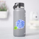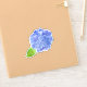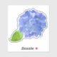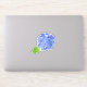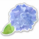 A vinyl sticker featuring a hydrangea flower in a with a variety of blue shades on the flower petal and a single avocado green leaf hand painted with watercolor.