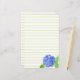 A green lined stationery paper featuring a hydrangea flower in a with a variety of blue shades on the flower petal and a single avocado green leaf hand painted with watercolor. You can remove the lines if you'd rather have a solid stationery and you can change the colour of the stationery.