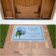 Light blue hydrangea flower custom doormat. Welcome guests to your home with this personalised doormat that comes in two sizes. A single cut hydrangea stem with light blue flower is the decoration with a border of thin green and blue lines around the mat. A bold printed font in dark blue reads, "Welcome to the" and thin, calligraphy style font beneath reads, "Name of family, home". You may change the text to read as you wish.