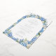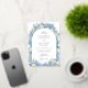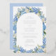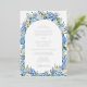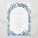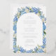 This elegant watercolor floral wedding design features an arch frame of blue hydrangea flowers, white roses, forget-me-not flowers, and lush greenery. Inspired by a classic English garden.