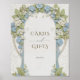Direct your guests with elegance using this refined “Cards and Gifts” wedding sign, beautifully framed by a cascade of blue hydrangeas, ivory blossoms, and leafy greenery. The arched floral border is adorned with intricate watercolor-style details, giving the sign a timeless botanical charm. Set against a soft ivory background, the mix of classic serif and delicate script typography adds a luxurious touch. Whether displayed on a welcome table or near the gift station, this sign blends seamlessly with romantic garden, spring, or vintage-inspired wedding décor.