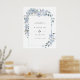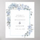 An elegant wedding welcome poster with a frame of cascading watercolor blue hydrangeas and leaves on a white background.